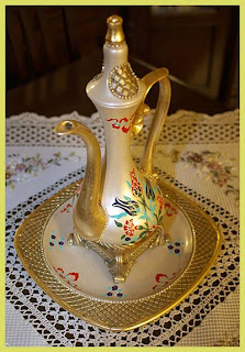Objede boyutlu baya ile çini deseni, yaprak ve folyo varak çalışmaları uygulanmış ve son olarak swarouskı taşlarla süslenmiştir.