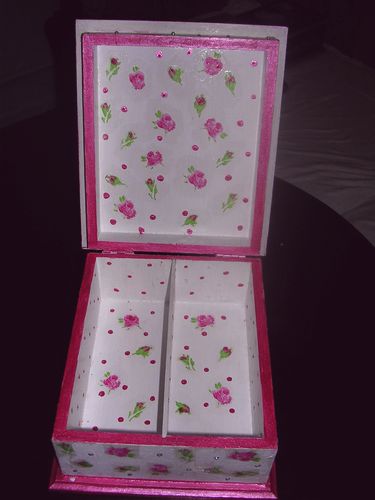 Kutunun üst tarafında dekopaj yan ve iç kısımlarda peçete kullandım boyutlu boyalarla süsledim resimde kırmızı gibi görünüyor ama asıl rengi çok tatlı bir şeker pembe. (decoupage wooden box and paper napkın used for jigsaw )