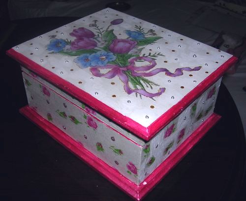 Kutunun üst tarafında dekopaj yan ve iç kısımlarda peçete kullandım boyutlu boyalarla süsledim resimde kırmızı gibi görünüyor ama asıl rengi çok tatlı bir şeker pembe. (decoupage wooden box and paper napkın used for jigsaw )