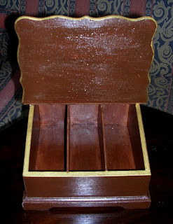 Çay kutusunun zeminini folkart antıquıng medıum 'a biraz glaze ( inceltici ve kurumayı geciktiren bir malzeme ) katarak inceltip eskitme uyguladım. Üst kapağı krem renkle boyayıp peçete desenlerimi uyguladım, kuruduktan sonra tekrar fırçama çok az antıquıng ve bolca glaze alarak ( glazi çok kullanınca daha açık bir kahve tonu elde ettim ) aynı yöne darbelerle eskittim. Son olarak çaykutusun da vernik kokusu istemediğimden su bazlı vernikle iki kat vernikledim.