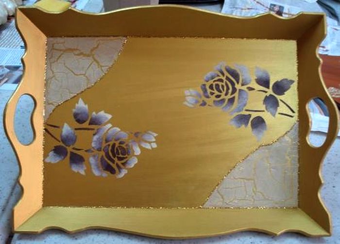 Sizlere bir başka tepsi örneği daha gönderiyorum. Bu tepsimiz de metalik altın rengine boyandı, köşe kısımlarına boya çatlatma ve stencıl ile desen uygulandı.